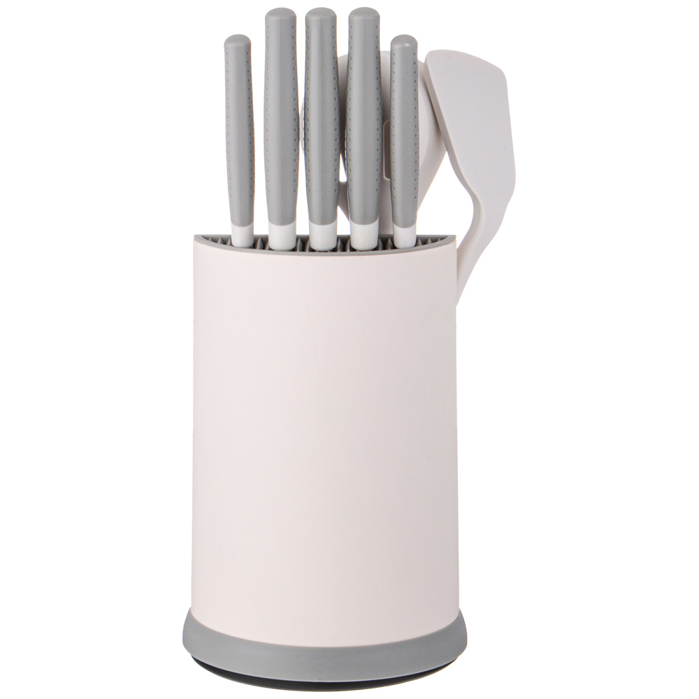 Состав набора: шеф нож 33см, нож для хлеба 33см, универсальный нож 33см, нож для офощей и фруктов 24см, нож для очистки овощей 20см, половник 31,5см, шумовка 32,3см, лопатка 32см, подставка 16,3х23,8см
