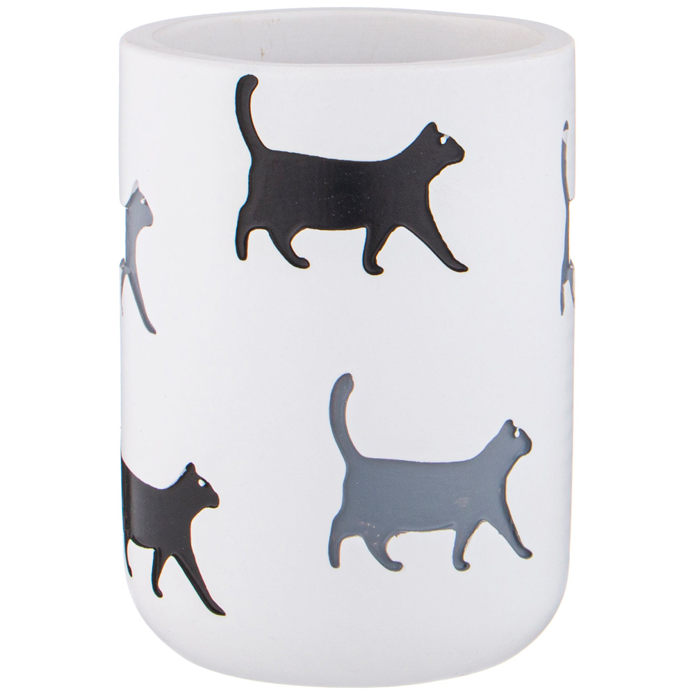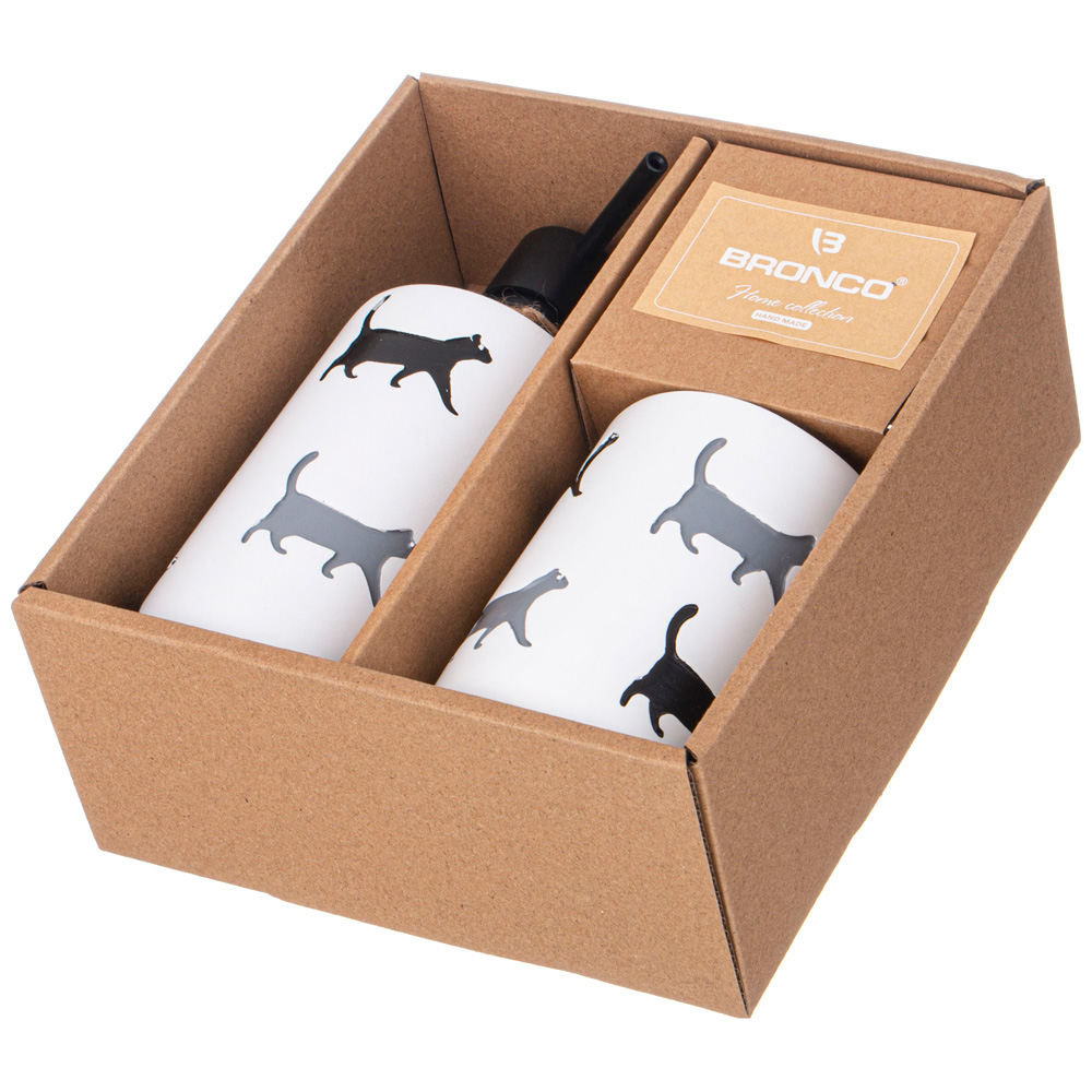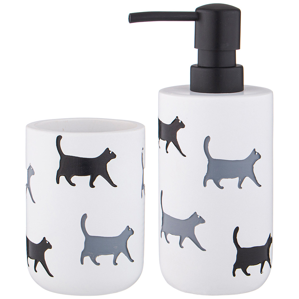Набор аксессуаров для ванной комнаты состоит из дозатора для жидкого мыла и подставки-стакана.