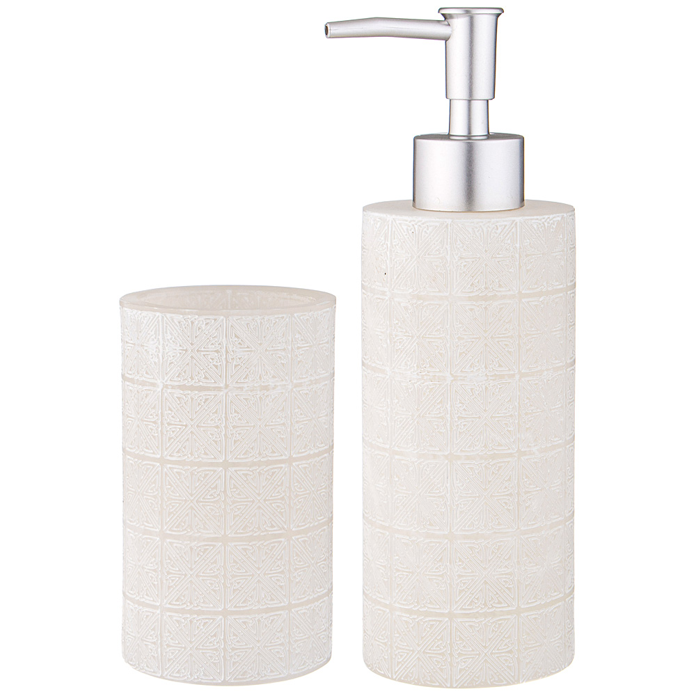 Набор аксессуаров для ванной комнаты состоит из дозатора для жидкого мыла и подставки-стакана.