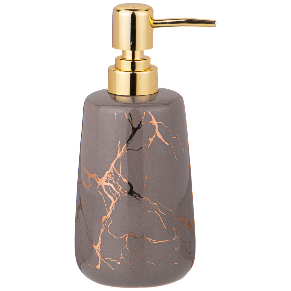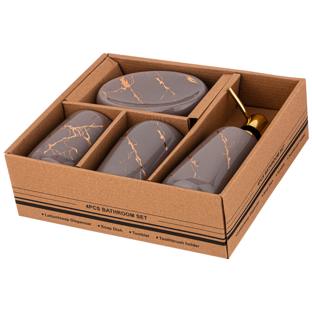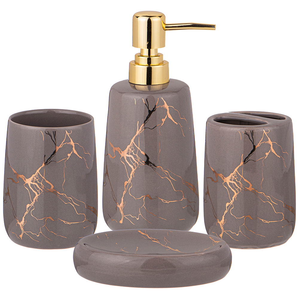 Набор аксессуаров для ванной комнаты состоит из дозатора для жидкого мыла, подставки-стакана, подставки для зубных щёток и мыльницы для кускового мыла.