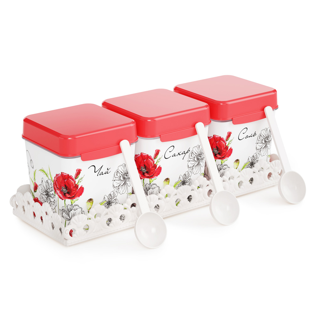 Набор ёмкостей на подставке♦ Способствует рациональному размещению продуктов♦ Декор: маки ♦ Тематическая надпись ♦ Яркий рисунок нанесен на изделия при помощи технологии IML (не стирается и не повреждается в процессе эксплуатации)♦ В комплект входит мерная ложка ♦ Изделие изготовлено из качественного пластикаЗаключаем договора по 44 ФЗ, 223 ФЗ