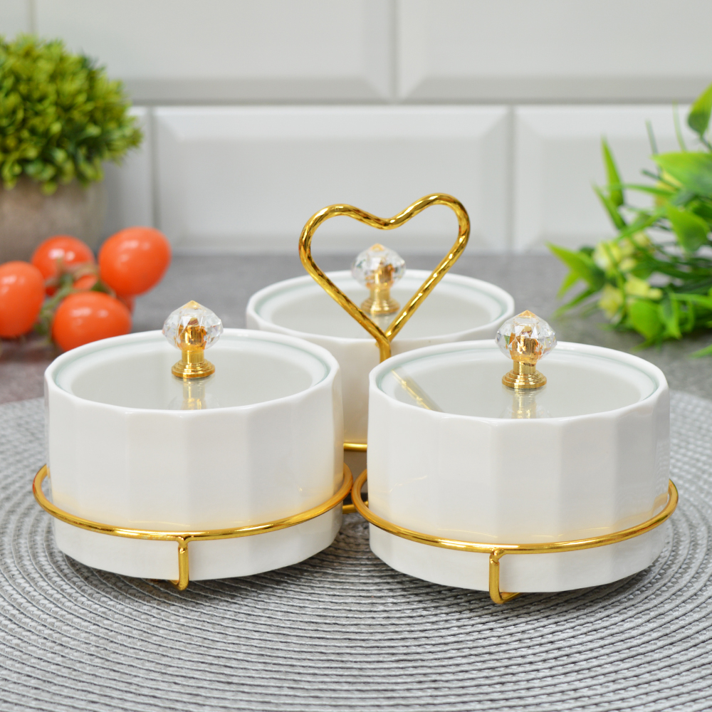 Набор фарфоровых блюд с крышками 3шт на подставке, 7350