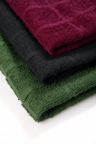Стильный набор махровых полотенец выполнен из натурального 100% хлопка, ткань махра высокой плотности (360 г/м2). Набор полотенец для кухни выполнен в бордовом цвете, в комплекте 3 шт. размером 30x70 см.