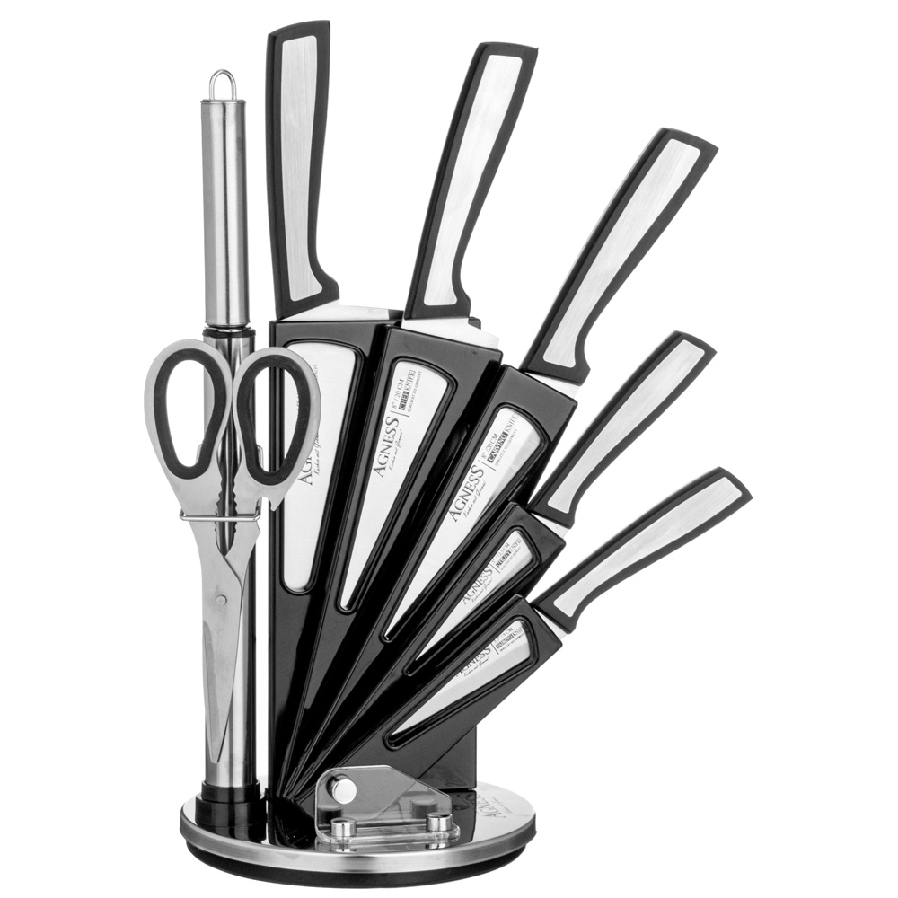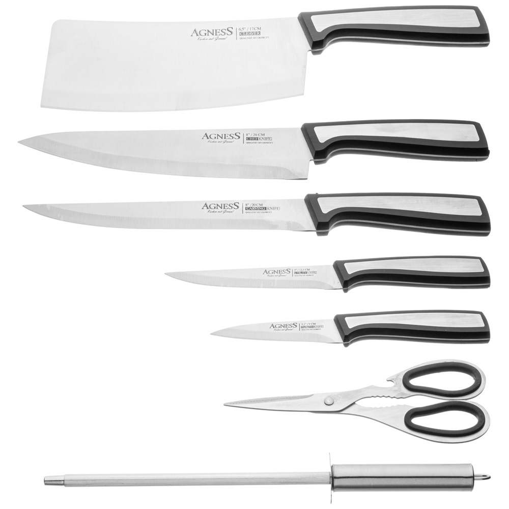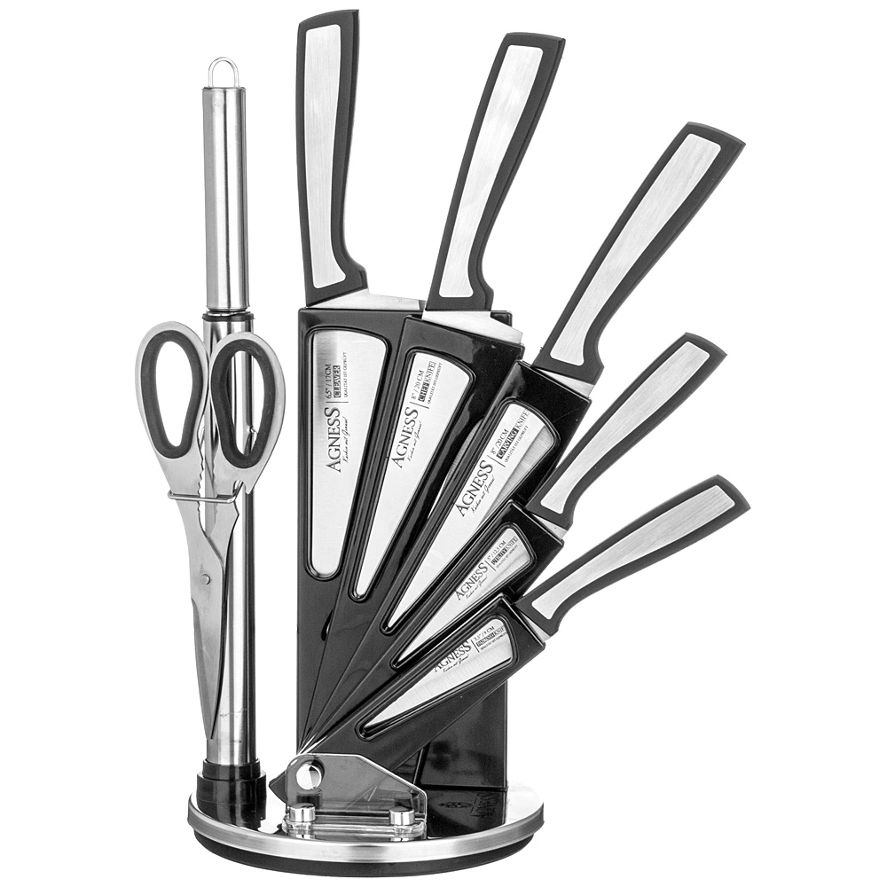 НАБОР НОЖЕЙ AGNESS С НОЖНИЦАМИ И МУСАТОМ НА ПЛАСТИКОВОЙ ПОДСТАВКЕ, 8 ПРЕДМЕТОВ
