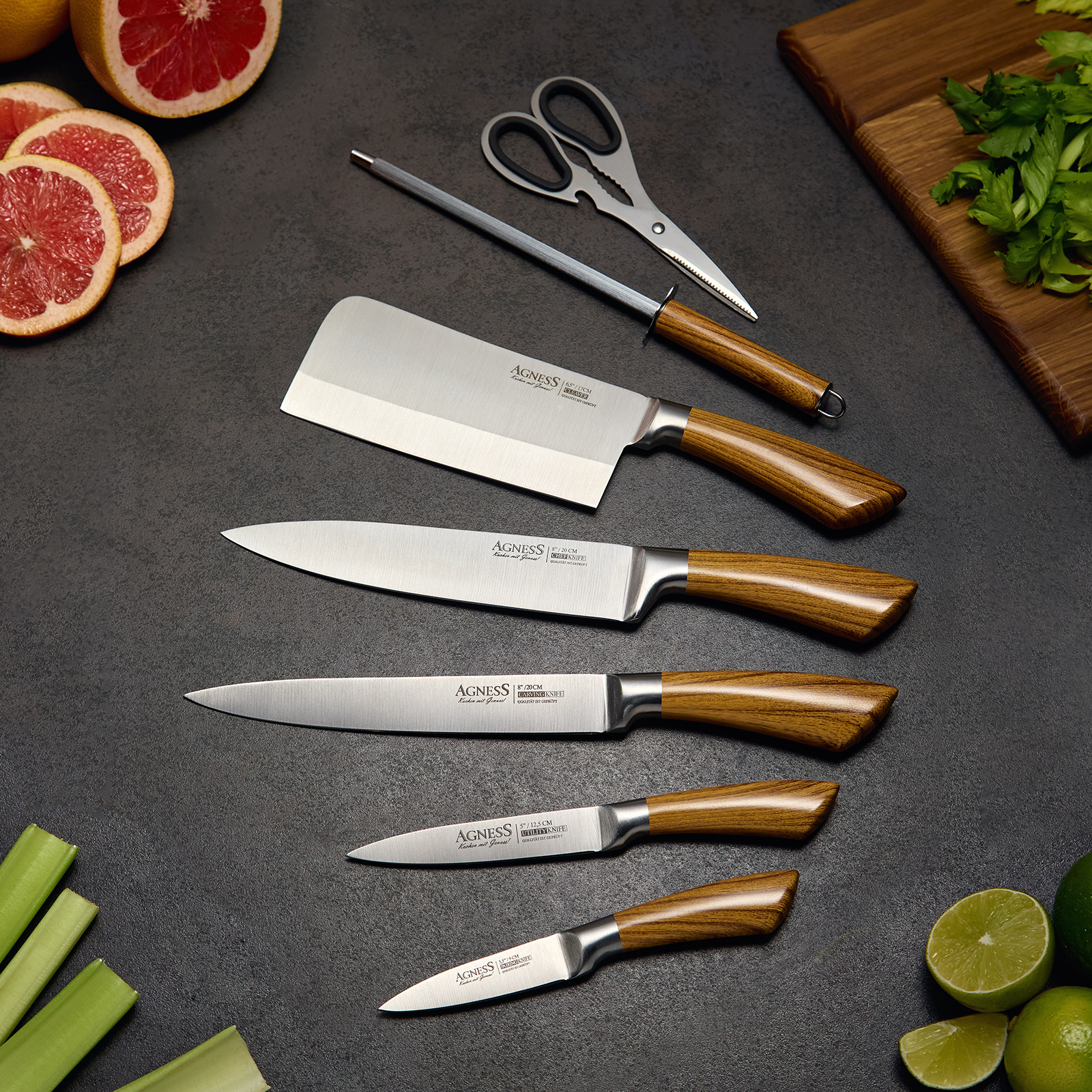 ● Состав набора: Топорик 17см, Нож поварской 20см, Нож для нарезки 20см, Нож универсальный 12,5см, Нож для чистки овощей и фруктов, 9см, Муссат, Ножницы, Складывающаяся вращающаяся пластиковая подставка для безопасного хранения ножей.