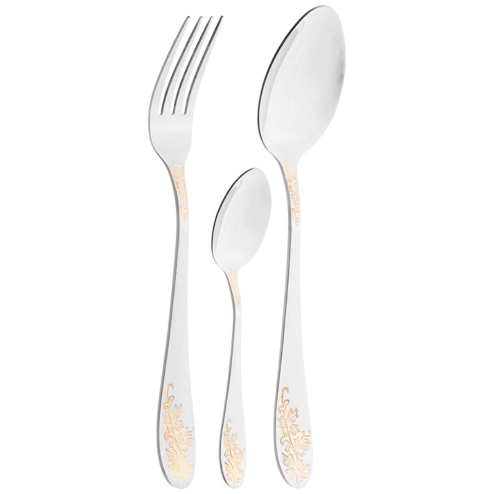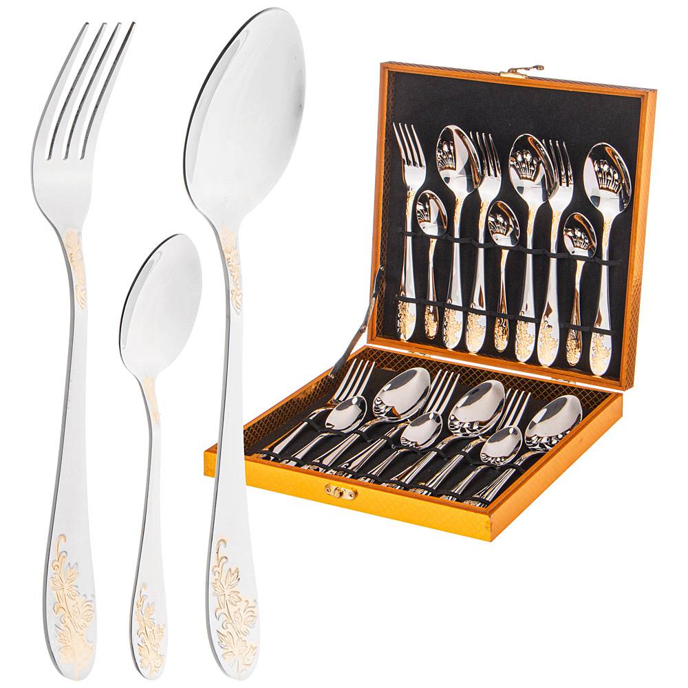Набор состоиз из 18пр. - 6 столовых ложек, 6 столовых вилок, 6 чайных ложек. Набор идет в подарочном деревянном кейсе, который также подойдет для дальнейшего хранения столовый приборов.