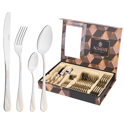Набор столовых приборов AGNESS не только прекрасно выглядит, но и обладает отличной функциональностью. Вилки и ложки имеют комфортные ручки, которые удобно держать в руке. Каждый предмет выполнен из нержавеющей стали 18/10, что обеспечивает долговечность и устойчивость к коррозии. Острые лезвия ножей с зубчиками позволяют легко нарезать пищу. Набор столовых приборов является отличным выбором для кухни, где они могут быть использованы в повседневной жизни или во время особых событий и праздников. Они также подходят для ресторанов и кафе, добавляя шарма и элегантности к сервировке стола. Благодаря своей прочности и изысканному дизайну, этот набор столовых приборов станет вашим надежным и стильным спутником на многие годы.Чтобы приборы прослужили долго необходимо соблюдать ряд правил по уходу: использовать мягкие материалы, щадящие моющие эко вещества, замачивать застарелые пятна, исключая механическое воздействие. Запрещается использовать абразивные и хлоросодержащие средства.