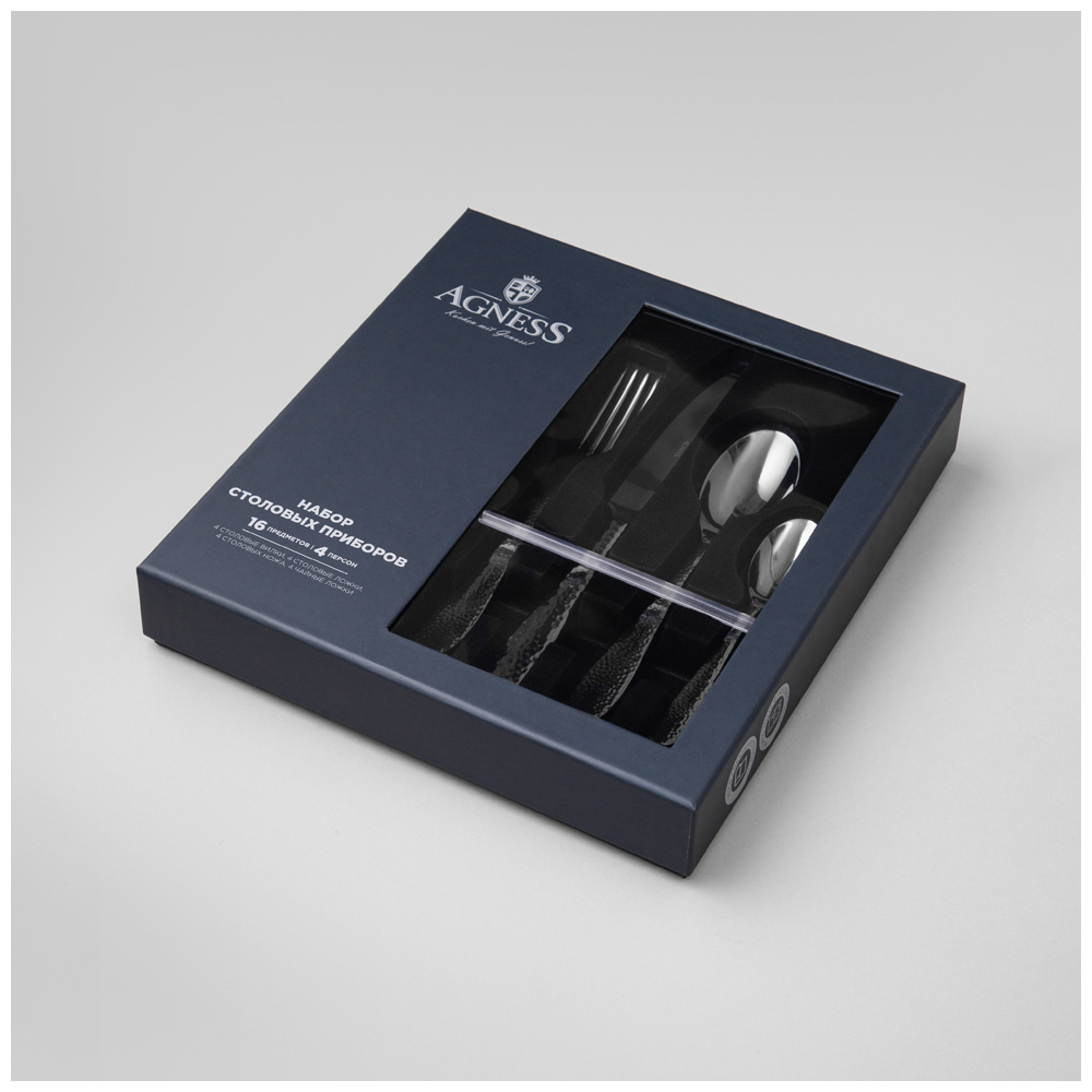 Набор столовых приборов AGNESS не только прекрасно выглядят, но и обладают отличной функциональностью. Вилки и ложки имеют комфортные ручки, которые удобно держать в руке. Каждый предмет выполнен из нержавеющей стали , что обеспечивает долговечность и устойчивость к коррозии. Набор столовых приборов является отличным выбором для кухни, где они могут быть использованы в повседневной жизни или во время особых событий и праздников. Они также подходят для ресторанов и кафе, добавляя шарма и элегантности к сервировке стола. Благодаря своей прочности и изысканному дизайну, этот набор столовых приборов станет вашим надежным и стильным спутником на многие годы.Чтобы приборы прослужили долго необходимо соблюдать ряд правил по уходу: использовать мягкие материалы, щадящие моющие эко вещества, замачивать застарелые пятна, исключая механическое воздействие. Запрещается использовать абразивные и хлоросодержащие средства. Можно мыть в посудомоечной машине. Рекомендуется ручная мойка ножей.