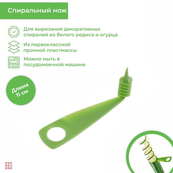 Нож декоратор предназначен для нарезки декоративных спиралей из огурцов, моркови, кабачков и других овощей.