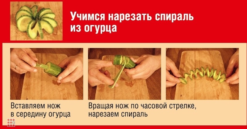 Отрежьте край овоща, вставьте в середину стержень ножа и плавно вращайте его. Полученную спираль можно использовать для украшения салатов и других блюд.