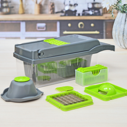 Овощерезка 14 в 1 с контейнером "TALENTIERT"Многофункциональная ручная кухонная овощерезка с контейнером и набором лезвий поможет быстро и легко нарезать овощи для любого салата, красиво сервировать овощную или фруктовую тарелку, приготовить суп или второе блюдо.Состав комплекта:• контейнер (объем 1,2 л)• дуршлаг для мытья и сушки овощей и фруктов• держатель для овощей (ваши руки защищены во время использования)• лезвия для нарезки (7 шт: соломка 2 мм, соломка 3 мм, ломтики/слайсер, волнитое лезвие, терка, кубики 6 мм, кубики 12 мм)• сепаратор для яиц• щеточка для чистки• контейнер для хранения лезвий.С помощью мультитерки можно:• шинковать капусту для салата, делать тонкие пластины из картофеля или яблок для чипсов• натирать шоколад и орехи, готовить панировку• нарезать овощи ломтикамиЗаключаем договора по 44 ФЗ, 223 ФЗ