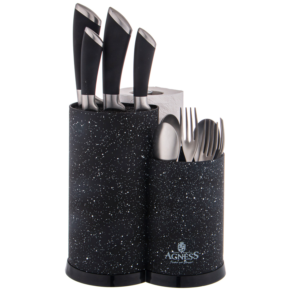 Подставка для ножей – необходимый аксессуар на каждой кухне. Подставка AGNESS с наполнителем и держателем для полотенец - это отличное решение для компактного хранения кухонных принадлежностей. Подставка легко и удобно решает проблему хранения ножей, защищая лезвия ножей от загрязнения. Дополнительный отсек можно использовать для хранения различных кухонных аксессуаров. Подставка для кухонных принадлежностей подходит для стандартных бумажных полотенец в рулонах.