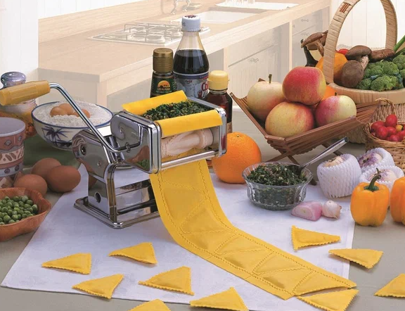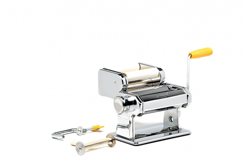 Машинка: 21*19,5*14см. Блок для раскатки теста, регулятор толщины теста, блок для изготовления пельменей, ручка, нож для резки теста, фиксатор. Состав: нержавеющая сталь.