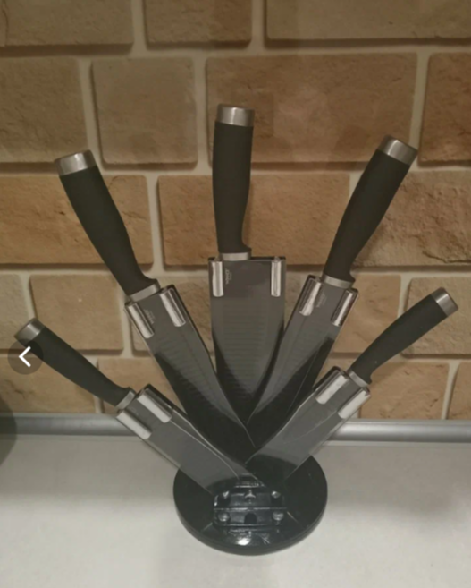 Набор из 5 ножей с подставкой. Ножи: поварской, нож для нарезки хлеба, нож для тонкой нарезки,нож универсальный, нож для очистки. Лезвия с черным полимерным покрытием Non-Stick, предотвращающим налипание продуктов, материал ручки- прорезиненный пластик в комбинации с нерж.сталью . Подставка акриловая. Подходит для чистки в посудомоечной машине. Вес 900г. Состав : нерж. сталь.