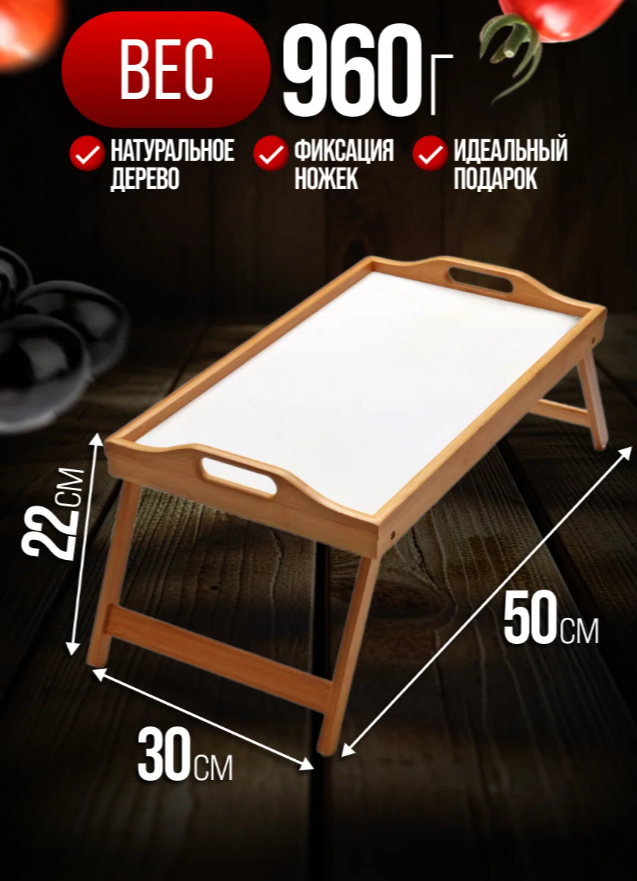 Размер столика в сложенном виде: длина 50 см, ширина 30 см, высота борта 4 см, высота с учетом ручек 6 см.