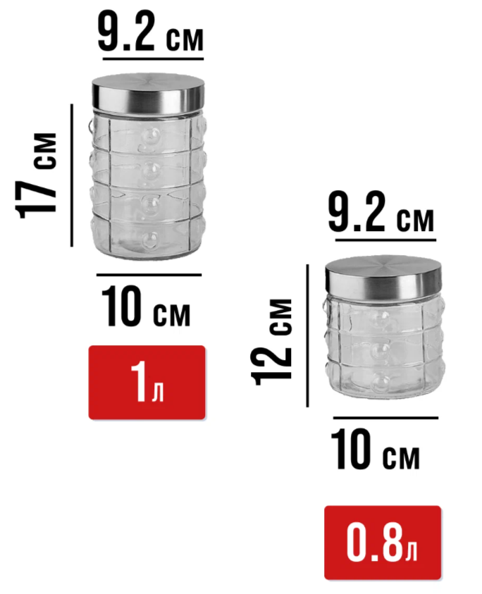 Размер банки 800 мл: диаметр горлышка 9,2 см, диаметр корпуса 11,5 см, диаметр дна 10 см, высота 12 см.