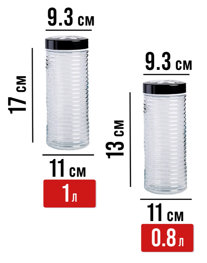 Размер банки 800 мл: диаметр горлышка 9,3 см, диаметр корпуса 11 см, высота с крышкой 13 см.