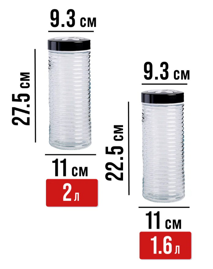 Размер банки 1,6 л: диаметр горлышка 9,3 см, диаметр корпуса 11 см, высота 22,5 см.
