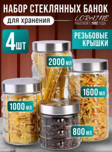 Набор 4 предмета: банки для сыпучих продуктов 800 мл, 1 л, 1,6 л, 2 л.