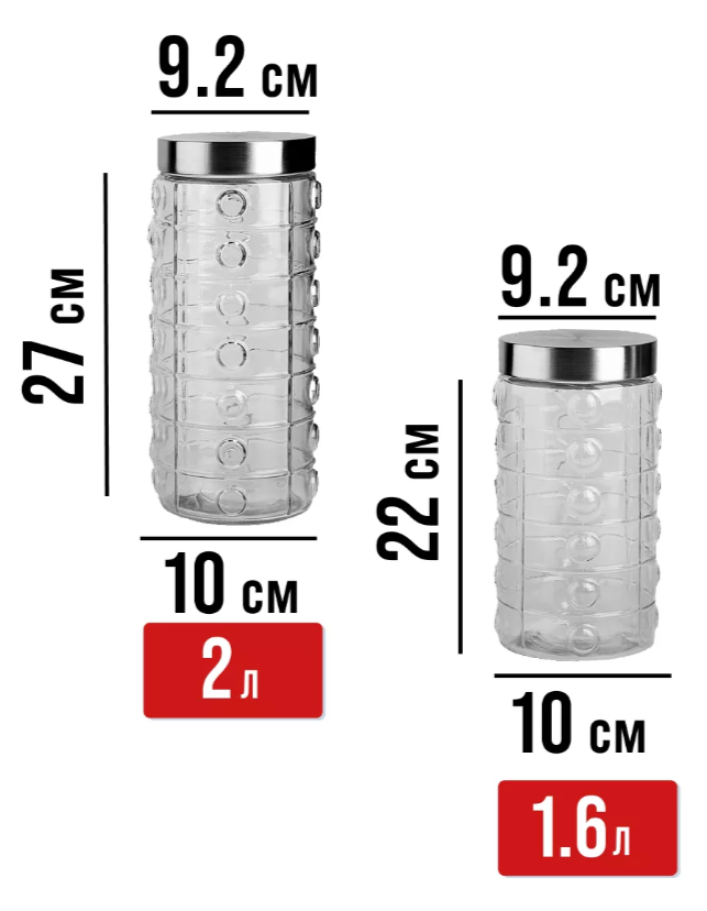 Размер банки 2 л: диаметр горлышка 9,2 см, длина 11 см, ширина 11 см, высота 22,5 см.