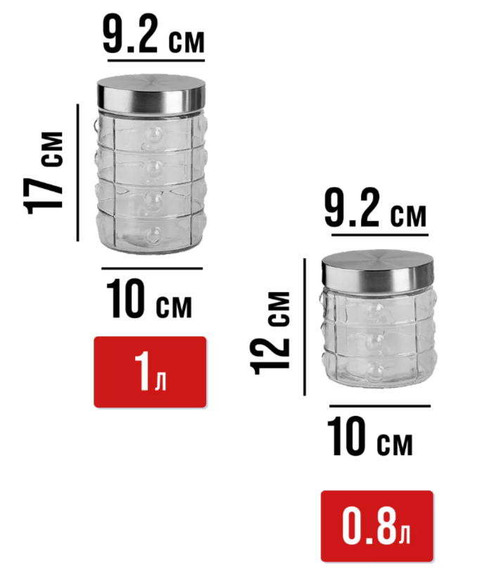 Размер банки 800 мл: диаметр горлышка 9,2 см, длина 11 см, ширина 11 см, высота 10,7 см.
