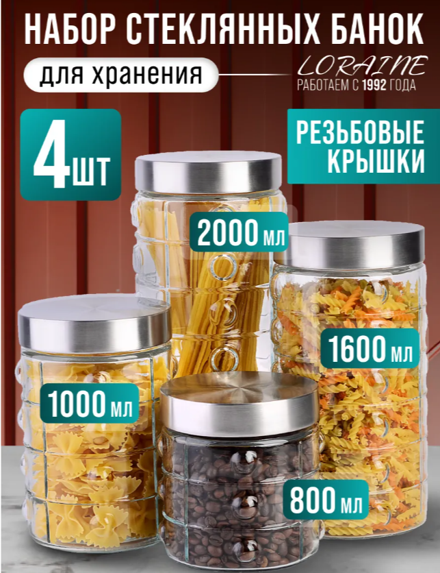 Набор 4 предмета: банки для сыпучих продуктов 800 мл, 1,3 л, 1,7 л, 2 л.