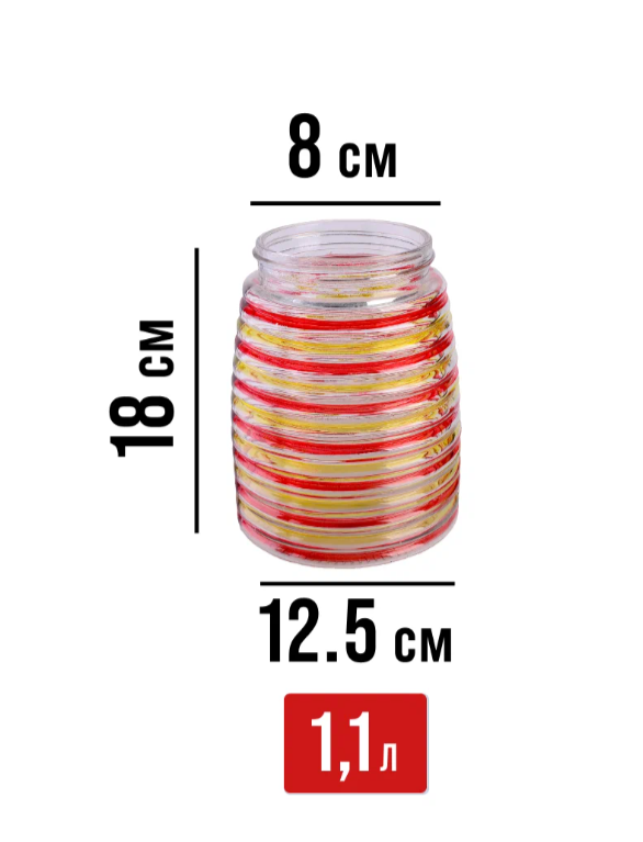 Размер банки 1,1 л: диаметр горлышка 8 см, диаметр корпуса 12,5 см, высота 18 см.
