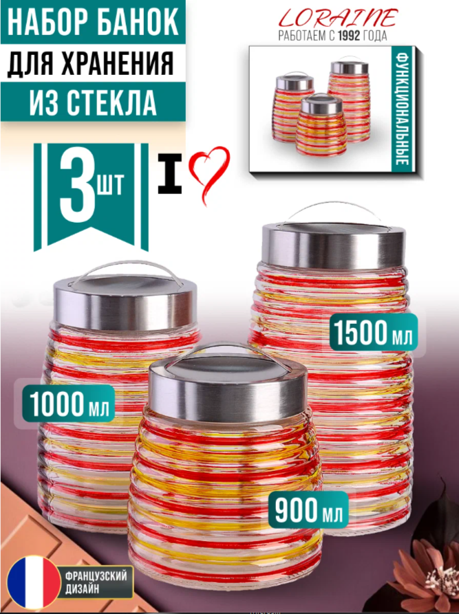 Набор 3 предмета: банки для сыпучих продуктов 900 мл, 1,1 л, 1,5 л.