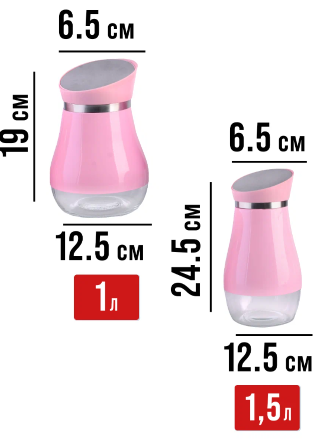 Размер банки 1,5 л: диаметр горлышка 6,5 см, диаметр корпуса 12,5 см, высота 24,5 см.