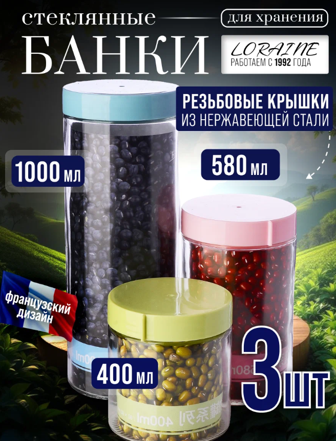 Банка с крышкой 1 л: диаметр корпуса 8,5 см, диаметр горлышка 7,5 см, диаметр дна 7,5 см, высота с крышкой 22 см.