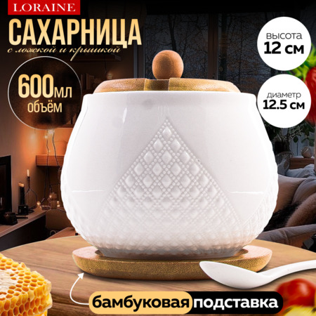 Погрузитесь в атмосферу уюта и элегантности с изысканной сахарницей, украшенной нежным рисунком. Этот стильный аксессуар станет не только функциональным элементом вашего стола, но и настоящим произведением искусства. Сахарница изготовлена из высококачественного фарфора, что придаёт ей изысканный внешний вид и облегчает уход за ней. Основной цвет — белый, который прекрасно сочетается с любым сервизом, а натуральное дерево добавляет тепла и текстуры вашему интерьеру. Объём сахарницы составляет 600 мл, что делает её вместительной для длительного хранения сахара. В комплект входят фарфоровая сахарница, аккуратная ложечка для удобного добавления сахара, деревянная крышка, защищающая сахар от влаги и загрязнений, а также деревянная подставка, предотвращающая загрязнение стола. Это идеальное дополнение как к утреннему чаю, так и к праздничному столу, подчёркивающее ваш уникальный стиль и вкусовые предпочтения. Подарите себе и своим близким частичку изысканности с этим великолепным предметом!