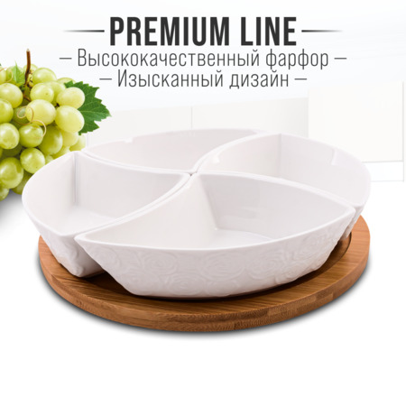 Менажница с рисунком роз — это изысканный и функциональный предмет, который станет неотъемлемой частью вашего стола. Изготовленная из высококачественного фарфора и натурального бамбука, она сочетает в себе нежный дизайн и практичность. Каждая секция менажницы выполнена в форме, благодаря которой вы можете разбирать конструкцию. Менажница занимает немного места и может храниться как в разобранном, так и в собранном виде. Это обеспечивает удобство хранения и использования. Идеально подходит для подачи закусок, соусов или сладостей на любой праздник или семейное торжество. Элегантный белый цвет фарфора в сочетании с тёплым оттенком бамбука создаёт атмосферу комфорта и стиля. Благодаря компактному и эстетичному дизайну менажница легко впишется в интерьер вашей кухни. Эта модель станет отличным подарком для любителей кулинарии и эстетов, добавив изысканности в их домашний интерьер.