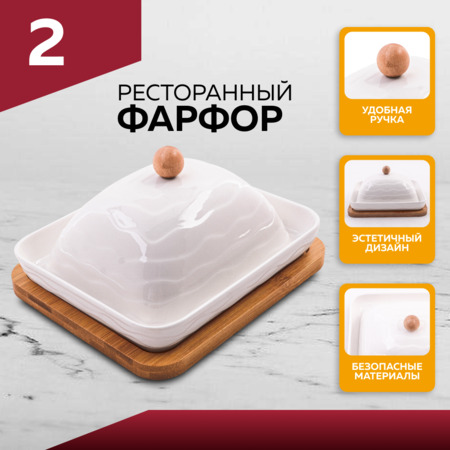 Современная и стильная масленка, выполненная в гармоничном сочетании белого фарфора и натурального бамбука. Элегантный дизайн с волнистыми линиями, удобная бамбуковая ручка и практичная подставка делают эту масленку идеальной для сервировки стола. Белый фарфор, из которого изготовлена емкость для масла, придает изделию легкость и чистоту. Он устойчив к царапинам и легко моется, сохраняя свой безупречный вид на протяжении долгого времени. Бамбуковая крышка плотно прилегает к фарфоровой основе, обеспечивая надежную защиту масла от посторонних запахов и влаги, тем самым сохраняя его свежесть и вкус. Преимущество использования белого фарфора заключается еще и в его гигиеничности. Он не впитывает запахи и не подвержен образованию плесени, что особенно важно при хранении пищевых продуктов. Бамбук, в свою очередь, является экологически чистым и возобновляемым материалом, что делает эту масленку не только красивой, но и дружелюбной к окружающей среде. Эта масленка не только функциональна, но и является стильным элементом декора. Ее минималистичный дизайн гармонично впишется в любой интерьер – от классического до современного. Она станет прекрасным дополнением к вашей кухне, будь то повседневный завтрак или праздничный обед. Благодаря своей компактности, данный комплект не займет много места на столе или в холодильнике. Она идеально подходит для хранения стандартного брикета сливочного масла. Легкая и удобная в использовании, она станет вашим незаменимым помощником на кухне. Почувствуйте разницу с этой элегантной и практичной масленкой.