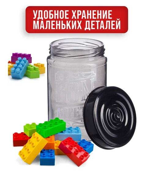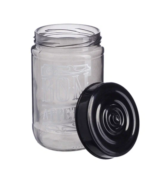 Банка с крышкой 1000 мл: диаметр горлышка 7,5 см, диаметр корпуса 9,5 см, диаметр дна 6,5 см, высота с крышкой 18 см, вес 404 г.