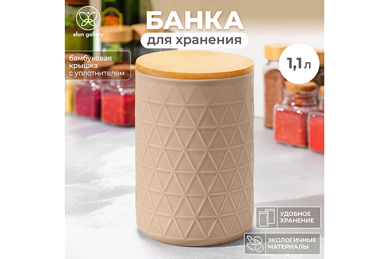 Банка «Аргайл» от Elan Gallery предназначена для организации хранения продуктов на вашей кухне. Размер ёмкости – 11х11х16 см, объём – 1,1 литр. Выполнена из керамики и имеет бежевый цвет, её поверхность украшена геометрическим рельефным узором. Крышка выполнена из натурального бамбука и оснащена силиконовым уплотнителем. Изделие отлично подойдёт для хранения сыпучих продуктов: сахара и соли, чая и кофе, приправ и специй. Храните в баночке ягоды, орехи и сухофрукты. Заполните её любимыми сладостями: леденцами, конфетами или печеньем. Подайте к столу, чтобы идеально дополнить чайную сервировку! Герметичная деревянная крышечка защитит ваши продукты от попадания грязи и пыли. Благодаря своему лаконичному дизайну и универсальному цвету изделие впишется в любой интерьер. Вы с лёгкостью организуете хранение даже на открытых полках. Не рекомендуется применять абразивные моющие средства. Без крышки подходит для использования в посудомоечной машине. Не подходит для использования в микроволновой печи. Бамбук нельзя замачивать! Поставляется в дизайнерской картонной коробке – благодаря ей вам не потребуется дополнительная подарочная упаковка. Это идеальный подарок для хозяйки, ценящей не только практичность, но и стиль. В ассортименте бренда Элан Галерея представлены банки для хранения на любой вкус. Соберите целый набор контейнеров для эстетичного хранения продуктов на вашей кухне! /