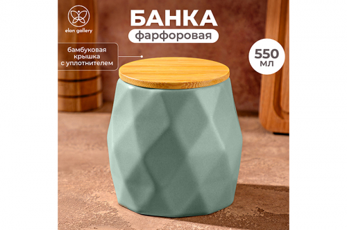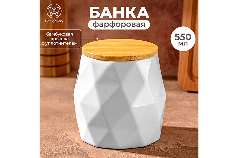 Банка от Elan Gallery предназначена для организации хранения продуктов на вашей кухне. Размер ёмкости – 10,5х10,5х10,5 см, объём – 550 мл. Выполнена из высококачественного белого фарфора. Он не впитывает цвет продуктов и легко отмывается, благодаря чему надолго сохранит свою белизну. Поверхность имеет необычный гранёный рельеф. Крышка выполнена из натурального бамбука и оснащена силиконовым уплотнителем. Изделие отлично подойдёт для хранения сыпучих продуктов: сахара и соли, чая и кофе, приправ и специй. Храните в баночке ягоды, орехи и сухофрукты. Заполните её леденцами, конфетами или небольшим печеньем. Подайте баночку к столу, чтобы идеально дополнить чайную сервировку! Герметичная деревянная крышка защитит ваши продукты от попадания грязи и пыли. Баночка впишется в любой интерьер и позволит организовать хранение даже на открытых полках. Не рекомендуется применять абразивные моющие средства. Без крышки подходит для использования в микроволновой печи и посудомоечной машине. Бамбук нельзя замачивать! Поставляется в дизайнерской картонной коробке – благодаря ей вам не потребуется дополнительная подарочная упаковка. Это идеальный подарок для хозяйки, ценящей не только практичность, но и стиль. В ассортименте бренда Элан Галерея представлены банки для хранения на любой вкус. Соберите целый набор для эстетичного хранения продуктов на вашей кухне! /