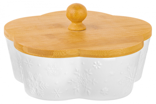Банка для печенья из серии «Снежинки» от Elan Gallery предназначена для эстетичной сервировки вашего стола. Размер изделия – 14,8х14,8х11,5 см, объём – 760 мл. Выполнена из высококачественного белого фарфора в форме цветка и украшена рельефным узором в виде снежинок. Крышка выполнена из натурального бамбука. Фарфор легко отмывается и не впитывает цвет продуктов, благодаря чему надолго сохранит свою белизну. Мы создали коллекцию новогодних и рождественских товаров для сервировки и декора, которые наполнят пространство атмосферой уюта. Изделия помогут оформить интерьер праздничными композициями и добавят нотку зимнего волшебства. Красивая ёмкость в форме цветка станет не только функциональным, но и эстетичным дополнением вашего кухонного инвентаря. Наполните баночку любимым печеньем, конфетами, рождественскими пряниками и любыми другими сладостями и выпечкой. Наполните разнообразными десертами, чтобы разделить угощение с семьёй и друзьями. Используйте для подачи закусок: ягод, орехов или фруктов. Наполните их дольками мандаринов, чтобы привнести в дом праздничную атмосферу. Подойдёт для хранения сыпучих продуктов: кофе, сахара и соли, специй и приправ. Крышка сервировочной баночки имеет свободную посадку, чтобы её было легко и быстро открывать. Не рекомендуется применять абразивные моющие средства. Без бамбуковой крышки подходит для использования в посудомоечной машине и микроволновой печи. Бамбук нельзя замачивать! Поставляется в дизайнерской картонной коробке – благодаря ей вам не потребуется дополнительная подарочная упаковка. В коллекции бренда Elan Gallery представлены посуда, сувениры и украшения с новогодней символикой. Каждый подберёт оригинальный сюрприз для семьи, друзей и коллег на Новый год и Рождество. Такой подарок наполнит дом семейным теплом и духом праздника! /