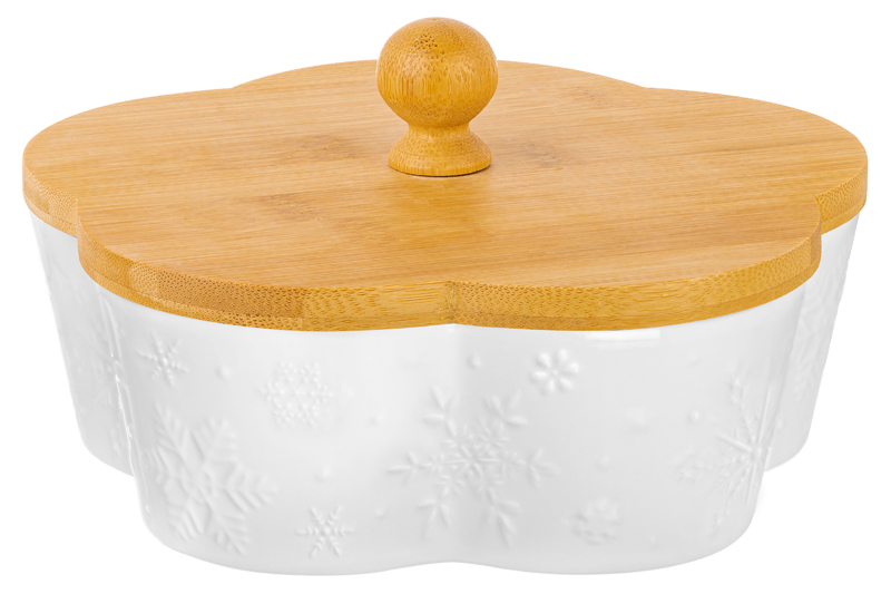 Банка для печенья из серии «Снежинки» от Elan Gallery предназначена для эстетичной сервировки вашего стола. Размер изделия – 19,5х19,5х10 см, объём – 900 мл. Выполнена из высококачественного белого фарфора в форме цветка и украшена рельефным узором в виде снежинок. Крышка выполнена из натурального бамбука. Фарфор легко отмывается и не впитывает цвет продуктов, благодаря чему надолго сохранит свою белизну. Мы создали коллекцию новогодних и рождественских товаров для сервировки и декора, которые наполнят пространство атмосферой уюта. Изделия помогут оформить интерьер праздничными композициями и добавят нотку зимнего волшебства. Красивая ёмкость в форме цветка станет не только функциональным, но и эстетичным дополнением вашего кухонного инвентаря. Наполните баночку любимым печеньем, конфетами, рождественскими пряниками и любыми другими сладостями и выпечкой. Наполните разнообразными десертами, чтобы разделить угощение с семьёй и друзьями. Используйте для подачи закусок: ягод, орехов или фруктов. Наполните их дольками мандаринов, чтобы привнести в дом праздничную атмосферу. Подойдёт для хранения сыпучих продуктов: кофе, сахара и соли, специй и приправ. Крышка сервировочной баночки имеет свободную посадку, чтобы её было легко и быстро открывать. Не рекомендуется применять абразивные моющие средства. Без бамбуковой крышки подходит для использования в посудомоечной машине и микроволновой печи. Бамбук нельзя замачивать! Поставляется в дизайнерской картонной коробке – благодаря ей вам не потребуется дополнительная подарочная упаковка. В коллекции бренда Elan Gallery представлены посуда, сувениры и украшения с новогодней символикой. Каждый подберёт оригинальный сюрприз для семьи, друзей и коллег на Новый год и Рождество. Такой подарок наполнит дом семейным теплом и духом праздника! /