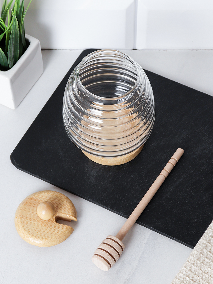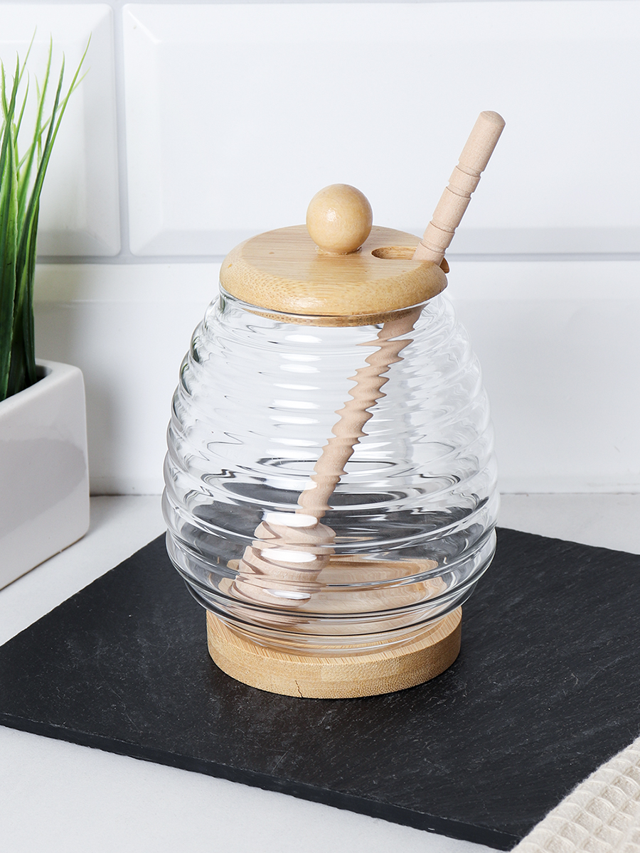 Банка для меда с ложкой на подставке бамбуковая крышка 400 мл / 7458 /уп 120/