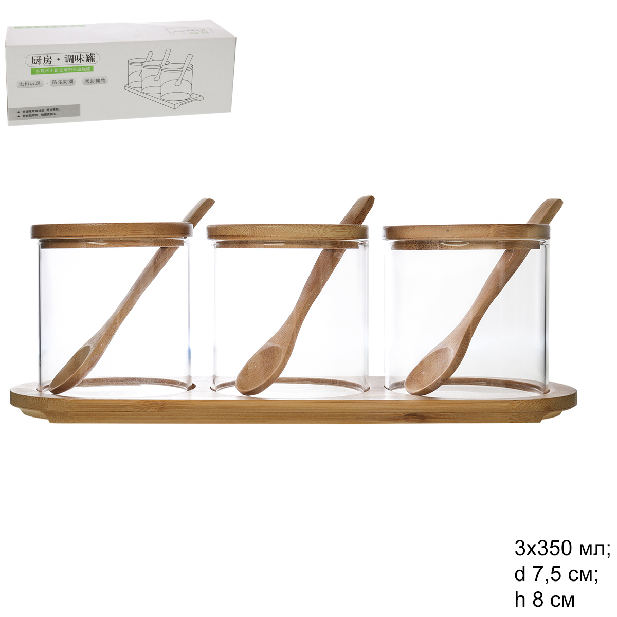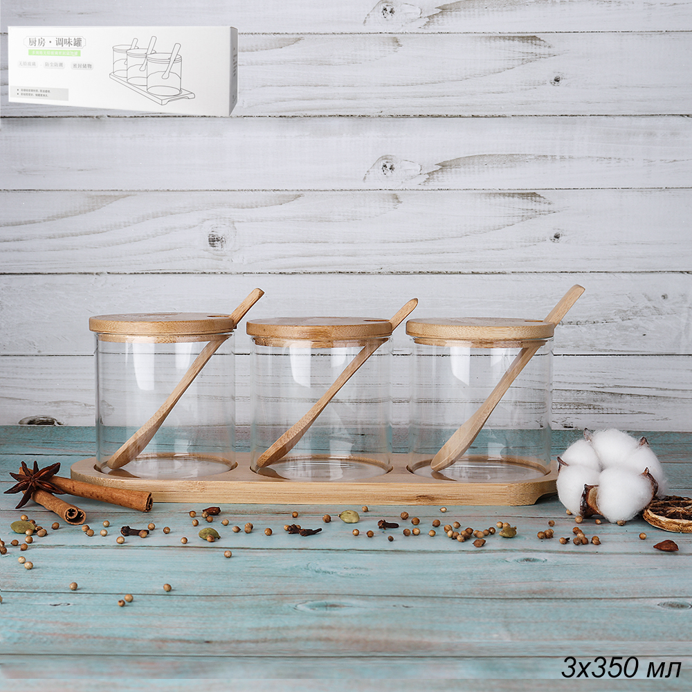 Банка для специй 3x350 мл с бамбуковой крышкой и ложками / GT-35-28 /уп 24/ на подставке