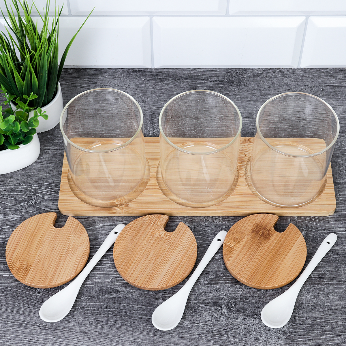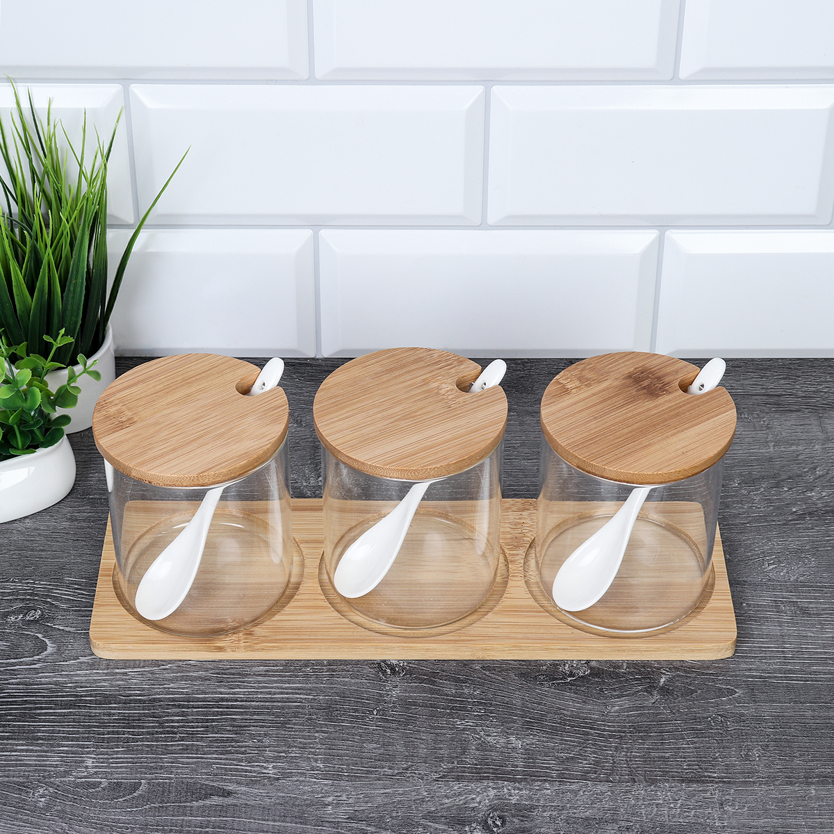 Банка для сыпучих продуктов 3 штуки 400 мл с ложкой / CF043 /уп 24/ на подставке