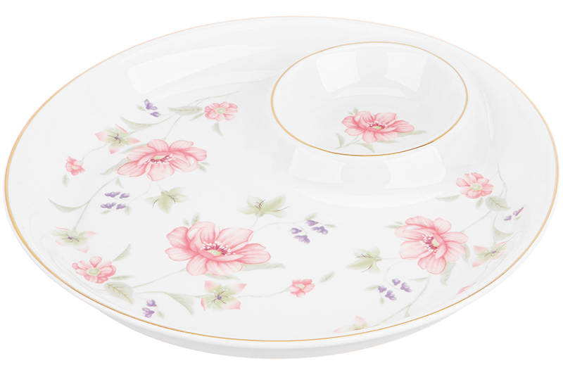 Блюдо с соусницей из серии «Диана» от Elan Gallery предназначено для эстетичной сервировки вашего стола. Размер изделия – 22х22х2,8 см. Объём соусницы – 50 мл. Выполнено из высококачественного фарфора нового поколения new bone china, сочетающего в себе изящность и высокую прочность. Такие изделия легко отмываются, поэтому сохраняют привлекательный вид и практичны в использовании. От других видов костяного фарфора new bone china отличается большей экологичностью в производстве. Поверхность изделия украшает воздушный цветочный рисунок и элегантное золотое окаймление. Круглый соусник – неотъемлемая часть фигурного блюда. Используйте его под кетчуп или майонез, а также для разнообразных жидких соусов. Положите в блюдо роллы или суши и заполните маленькую ёмкость соевым соусом, васаби или имбирём. Сервировочное блюдо пригодится, чтобы создать идеальную атмосферу для приёма гостей и романтического домашнего ужина. Возьмите блюдо с высокими бортиками на дачу или пикник. Положите в него кусочек пиццы, рыбы или холодца, наполните салатом, сыром и нарезками. Подайте к столу фрукты, овощи и сухофрукты. Благодаря нежному дизайну оно впишется в интерьер любой кухни, гостиной или столовой. Не рекомендуется применять абразивные моющие средства. Не использовать в посудомоечной машине, микроволновой печи и духовом шкафу. Поставляется в дизайнерской картонной коробке – благодаря ей вам не потребуется дополнительная подарочная упаковка. Фарфоровая сервировочная посуда будет оригинальным подарком для хозяйки, ценящей не только практичность, но и привлекательность. Серия «Диана» от бренда Элан Галерея подарит вам ощущение мечтательной лёгкости! /