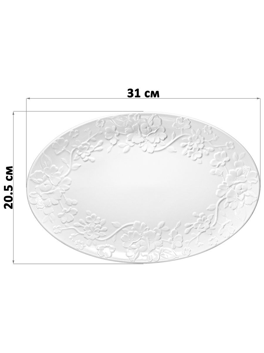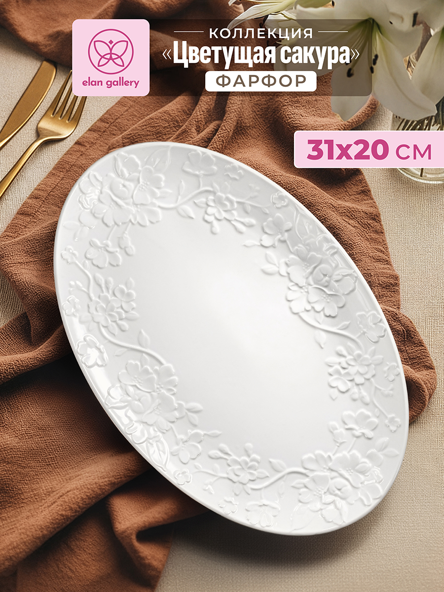 Овальное блюдо Elan Gallery "Цветущая сакура" размером 31х20,5х2,5 см выполнено из белого фарфора в классическом дизайне. Подойдет для подачи рыбных или мясных блюд. Можно использовать для сервировки нарезки, овощей или фруктов для угощения большого количества гостей. Посуда серии украшена рельефным узором с цветами. Эргономичная форма тарелки позволит использовать её как поднос. Удобно разместить на сервировочном блюде торт, пироги и другие сладости для угощения большого количества гостей. Фарфоровая посуда отличается от керамической повышенной плотностью. Фарфор не впитывает цвет продуктов и не деформируется от влаги, чему может быть подвержена керамика. Не рекомендуется применять абразивные моющие средства. Можно использовать в микроволновой печи и мыть в посудомоечной машине. Станет отличным подарком для ценителей стильной сервировки. Поставляется в картонной коробке. Благодаря коробочке с логотипом бренда не понадобится дополнительная подарочная упаковка. Особенно понравится любителям посуды в скандинавском стиле. Серия "Цветущая сакура" позволит собрать сервиз в едином стиле и станет украшением вашего дома!
