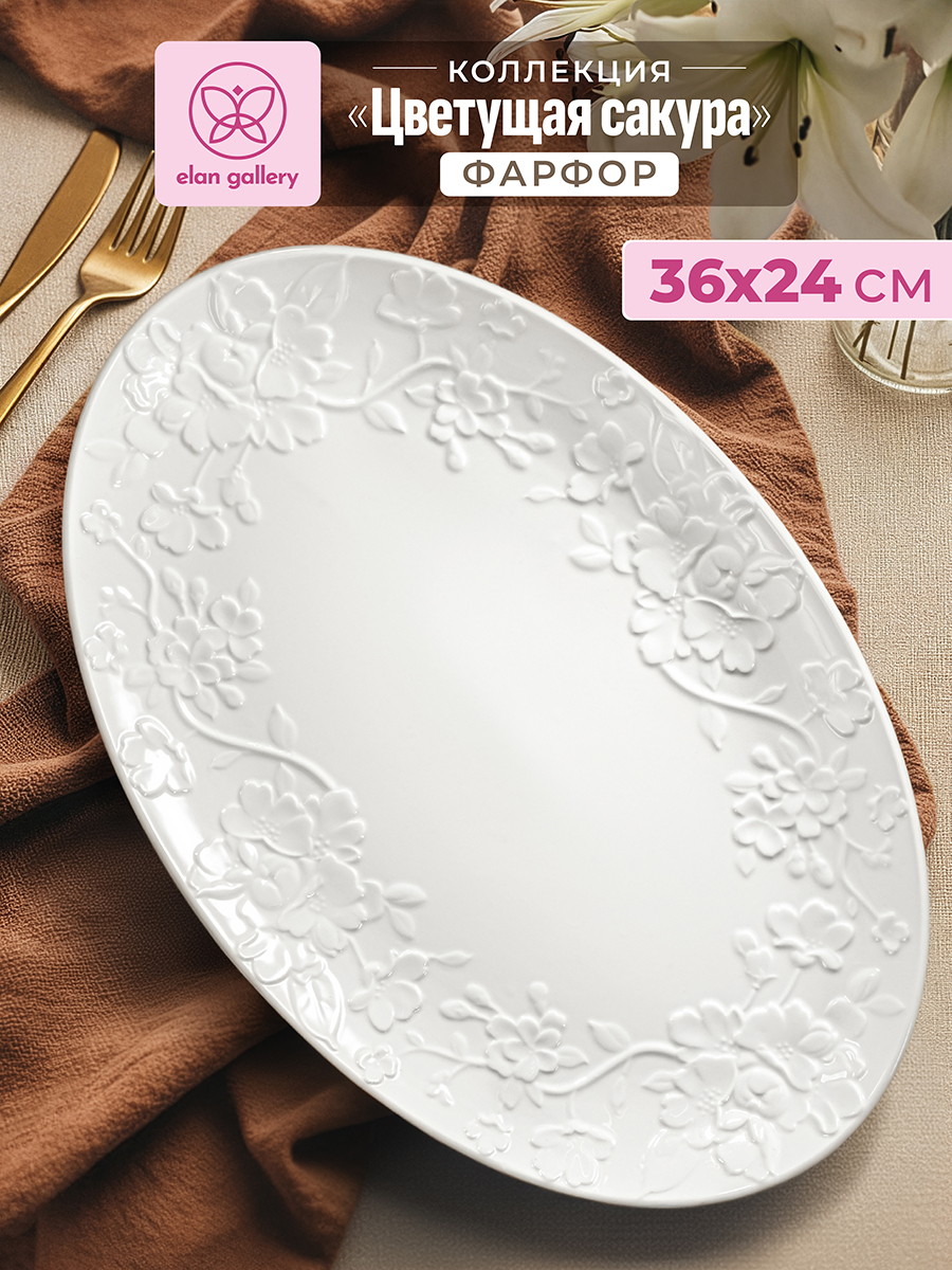 Овальное блюдо Elan Gallery "Цветущая сакура" размером 36,5х24х3 см выполнено из белого фарфора в классическом дизайне. Подойдет для подачи рыбных или мясных блюд. Можно использовать для сервировки нарезки, овощей или фруктов для угощения большого количества гостей. Посуда серии украшена рельефным узором с цветами. Эргономичная форма тарелки позволит использовать её как поднос. Удобно разместить на сервировочном блюде торт, пироги и другие сладости для угощения большого количества гостей. Фарфоровая посуда отличается от керамической повышенной плотностью. Фарфор не впитывает цвет продуктов и не деформируется от влаги, чему может быть подвержена керамика. Не рекомендуется применять абразивные моющие средства. Можно использовать в микроволновой печи и мыть в посудомоечной машине. Станет отличным подарком для ценителей стильной сервировки. Поставляется в картонной коробке. Благодаря коробочке с логотипом бренда не понадобится дополнительная подарочная упаковка. Особенно понравится любителям посуды в скандинавском стиле. Серия "Цветущая сакура" позволит собрать сервиз в едином стиле и станет украшением вашего дома!