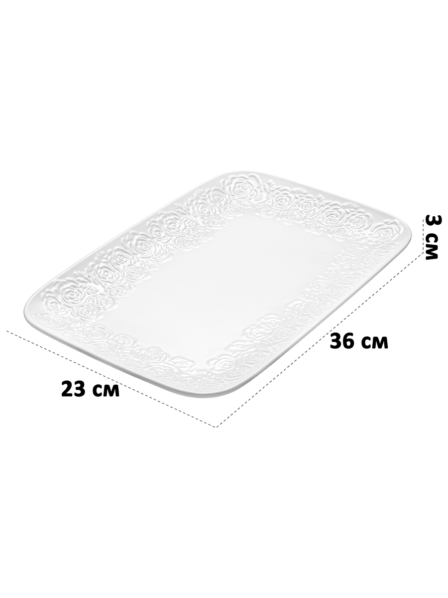 Блюдо из серии «Розы» от Elan Gallery предназначено для эстетичной сервировки вашего стола. Размер изделия – 36х23х3 см. Выполнено из высококачественного белого фарфора. Он не впитывает цвет продуктов и легко отмывается, благодаря чему надолго сохраняет свою белизну. Размер изделия – 36х23х3 см. Выполнено из высококачественного белого фарфора. Он не впитывает цвет продуктов и легко отмывается, благодаря чему надолго сохранит свою белизну. Кайма изделия украшена рельефным узором в виде пышных бутонов роз. Используйте прямоугольное блюдо для подачи сыра и колбасы, а также рыбных и мясных деликатесов. Красиво подайте на завтрак бутерброды из хлеба с сырной или мясной нарезкой. Идеально подойдёт для сервировки закусок – суши, роллов, канапе, а также салатов, свежих фруктов и овощей. Наполните его десертами и сладостями, например, печеньем, зефиром, кусочками торта или пирога. Блюдо станет незаменимым элементом сервировки как в будни, так и на праздник. Не рекомендуется применять абразивные моющие средства. Можно использовать в посудомоечной машине и микроволновой печи. Поставляется в дизайнерской картонной коробке – благодаря ей вам не потребуется дополнительная подарочная упаковка. Фарфоровая сервировочная посуда будет оригинальным подарком для хозяйки, ценящей не только практичность, но и привлекательность. Серия «Розы» от бренда Элан Галерея станет украшением любого кухонного инвентаря и позволит собрать красивый сервиз в едином стиле!