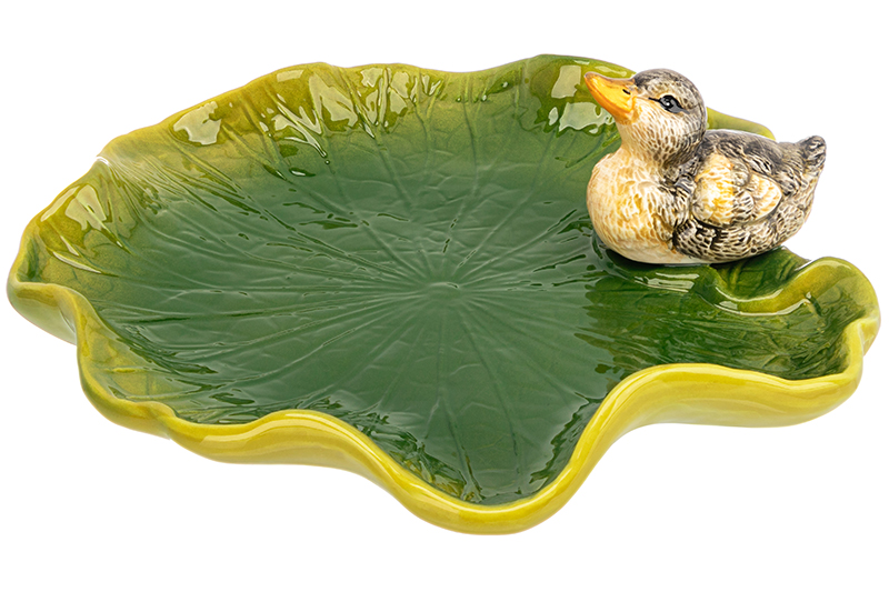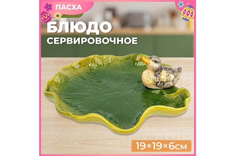 Блюдо «Уточка» от Elan Gallery предназначено для эстетичной сервировки вашего стола. Размер изделия – 19х19х6 см. Выполнено из керамики в виде зелёного листа, на котором сидит маленькая уточка. Подойдёт для подачи мясных и рыбных блюд, а также разнообразных закусок. Используйте её для сервирования салатов, сырной нарезки, овощей и фруктов. Она поможет угостить большое количество гостей. Удобно разместите на фигурном сервировочном блюде кусочки торта или пирога, конфеты, зефир, а также другие сладости и десерты. Задействуйте для подачи суши, роллов или бутербродов на завтрак. Благодаря необычному дизайну сервировочная тарелочка разнообразит интерьер кухни, столовой или гостиной. Добавьте вашему дому тепла вместе с симпатичной птичкой. Не рекомендуется применять абразивные моющие средства. Не подходит для использования в посудомоечной машине и микроволновой печи. Поставляется в дизайнерской картонной коробке – благодаря ей вам не потребуется дополнительная подарочная упаковка. В коллекции бренда Элан Галерея представлен богатый выбор декоративной посуды и красивых сувениров – каждый обязательно подберёт вариант на свой вкус. Они станут оригинальным подарком для родных, близких и коллег. Преобразите пространство вокруг себя, наполнив его неповторимым очарованием!