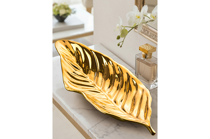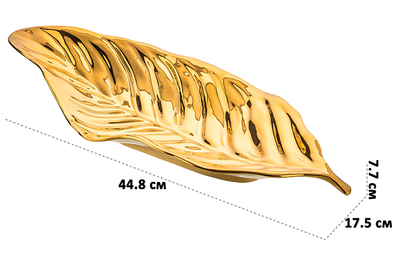 Фигурное сервировочное блюдо «Лист» предназначено для подачи разнообразных угощений и оформления декоративных композиций. Размер изделия – 44,8х17,5х7,7 см. Выполнено из качественного фарфора в форме большого детализированного листика золотого цвета. Фарфор не впитывает цвет продуктов и надолго сохранит свой изначальный вид. Декоративная фарфоровая тарелка украсит любой интерьер благодаря своему необычному дизайну и удивит даже самых привередливых гостей. Подойдёт для подачи сыра и колбасы, а также рыбных и мясных деликатесов. Красиво подайте к столу бутерброды с хлебом и сырной нарезкой. Идеально для сервировки закусок – суши, роллов и канапе, а также салатов, свежих фруктов и овощей. Наполните его десертами и сладостями: конфетами, печеньем, кусочками торта и пирога. Оригинальное блюдо послужит для украшения вашего дома в качестве декора. Поставьте его на тумбочку или полку в качестве самостоятельного декоративного элемента, сделайте частью композиции с искусственными фруктами, сухоцветами и другими предметами, чтобы украсить свой дом и привнести интерьеру изысканности. Не рекомендуется применять абразивные моющие средства. Не подходит для использования в микроволновой печи. Можно использовать в посудомоечной машине. Посуда поставляется в красивой картонной коробке – благодаря ей вам не потребуется дополнительная подарочная упаковка. Это приятный подарок на праздник для хозяйки, ценящей не только практичность, но и стиль. В коллекции бренда Elan Gallery представлено много товаров для создания комфорта и уюта на вашей кухне. Тарелка добавит роскоши вашему дому и создаст праздничную атмосферу даже в будний день!