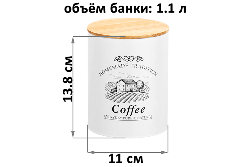 Набор 2 банок для хранения послужит органайзером на вашей кухне. Размер каждой ёмкости – 11х11х13,8 см, объём – 1,1 литра. Крышки выполнены из натурального бамбука, обеспечивают герметичность закрывания и целостность содержимого. На белую поверхность жестяных изделий нанесён минималистичный рисунок в виде деревенского домика на фоне полей, а также надписи на английском: «Homemade tradition. Coffee. Everyday pure & natural» («Домашняя традиция. Кофе. Ежедневная чистота и натуральность»). Отлично подойдут для разнообразных сыпучих продуктов: чая, кофе, сахара и соли, приправ и специй. Храните в них крупы и макаронные изделия, а также ягоды, орехи и сухофрукты. Заполните контейнеры сладостями и другими угощениями: конфетами, леденцами или печеньем. Подайте баночки к столу, чтобы идеально дополнить чайную сервировку! Не рекомендуется применять абразивные моющие средства. Не подходят для использования в посудомоечной машине и микроволновой печи. Бамбук нельзя замачивать! Поставляются в красивой картонной коробке – благодаря ей вам не потребуется дополнительная подарочная упаковка. Это идеальный подарок для хозяйки, ценящей не только практичность, но и стиль. Баночки создадут уют тёплой домашней атмосферы и подчеркнут вашу оригинальность!