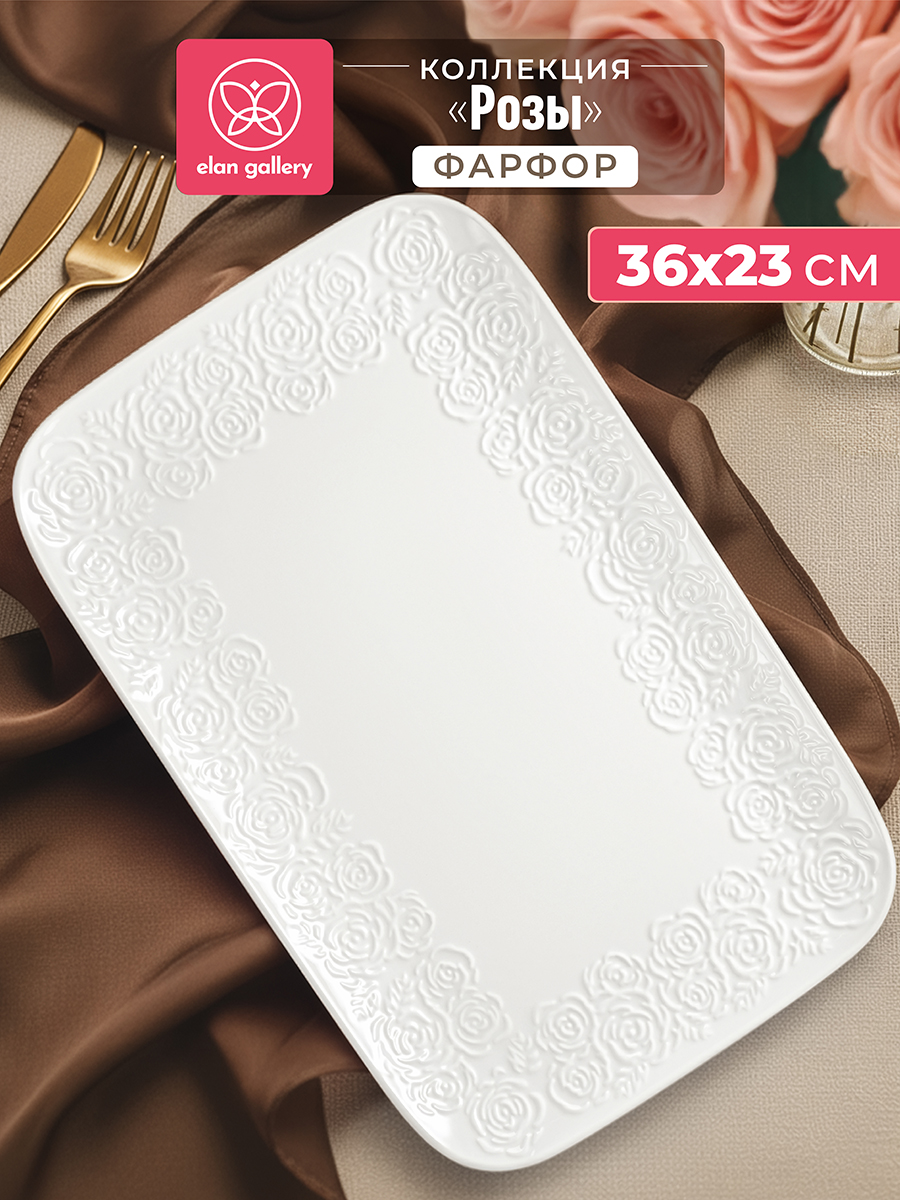 Блюдо из серии «Розы» от Elan Gallery предназначено для эстетичной сервировки вашего стола. Размер изделия – 36х23х3 см. Выполнено из высококачественного белого фарфора. Он не впитывает цвет продуктов и легко отмывается, благодаря чему надолго сохраняет свою белизну. Размер изделия – 36х23х3 см. Выполнено из высококачественного белого фарфора. Он не впитывает цвет продуктов и легко отмывается, благодаря чему надолго сохранит свою белизну. Кайма изделия украшена рельефным узором в виде пышных бутонов роз. Используйте прямоугольное блюдо для подачи сыра и колбасы, а также рыбных и мясных деликатесов. Красиво подайте на завтрак бутерброды из хлеба с сырной или мясной нарезкой. Идеально подойдёт для сервировки закусок – суши, роллов, канапе, а также салатов, свежих фруктов и овощей. Наполните его десертами и сладостями, например, печеньем, зефиром, кусочками торта или пирога. Блюдо станет незаменимым элементом сервировки как в будни, так и на праздник. Не рекомендуется применять абразивные моющие средства. Можно использовать в посудомоечной машине и микроволновой печи. Поставляется в дизайнерской картонной коробке – благодаря ей вам не потребуется дополнительная подарочная упаковка. Фарфоровая сервировочная посуда будет оригинальным подарком для хозяйки, ценящей не только практичность, но и привлекательность. Серия «Розы» от бренда Элан Галерея станет украшением любого кухонного инвентаря и позволит собрать красивый сервиз в едином стиле!