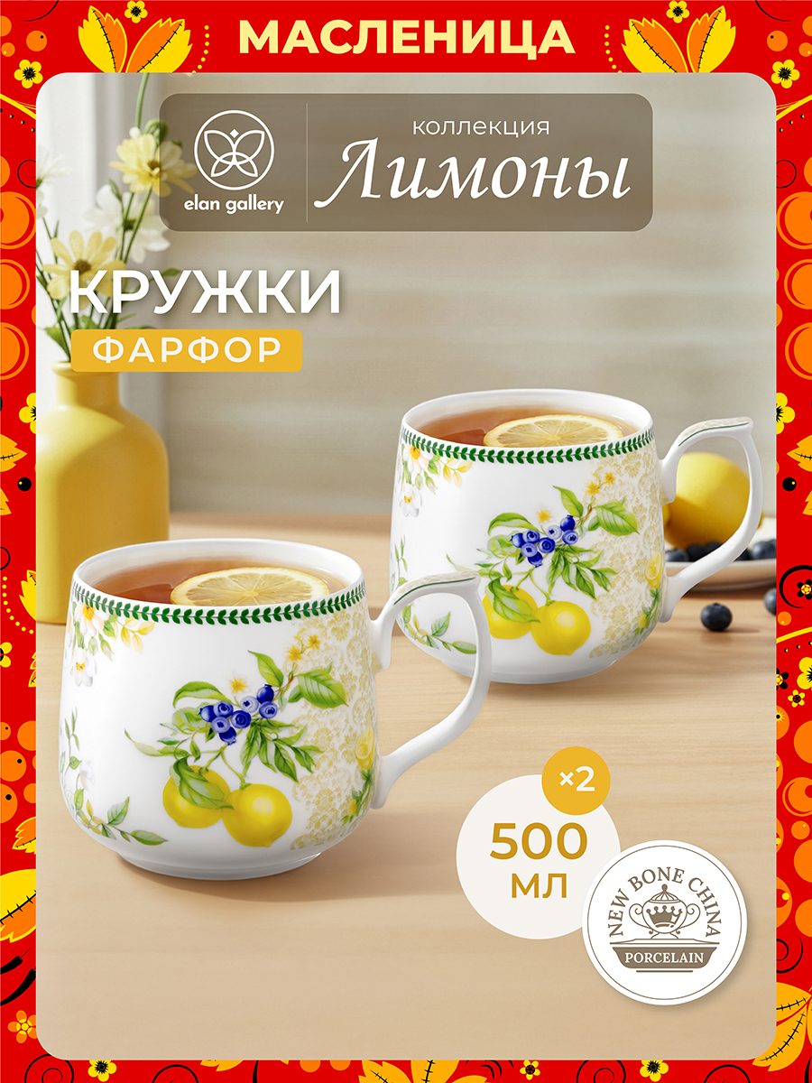 Набор 2 кружек из серии «Лимоны» от Elan Gallery предназначен для эстетичной сервировки вашего стола. Размер каждой ёмкости – 13,5х10х9 см, объём – 500 мл. Выполнены из фарфора нового поколения new bone china, сочетающего в себе изящность и высокую прочность. За счёт гладкости изделия легко отмываются, поэтому сохраняют привлекательный внешний вид и практичны в использовании. От других видов костяного фарфора new bone china отличается большей экологичностью в производстве. Поможет отпраздновать Широкую Масленицу со вкусом! Масленица – это чудесный повод собраться за праздничным столом и насладиться тёплой атмосферой и традиционной русской кухней. В ассортименте бренда Elan Gallery вы найдёте предметы декора и красивую посуду для приготовления и сервировки масленичных блюд. Пусть Масленичная неделя принесет вам радость и множество вкусных моментов! Серия украшена ярким рисунком лимонов. Кофейные кружки помогут вам провести множество приятных завтраков с капучино и латте, а также уютные чайные вечера с конфетами, вафлями, другими десертами и сладостями. Подойдут ценителям чая и кофе, которые любят пить из красивой и необычной посуды. Согрейтесь зимой любимым напитком: какао с маршмэллоу, ягодным чаем или горячим шоколадом. Летом освежитесь домашним лимонадом или морсом. Не рекомендуется применять абразивные моющие средства. Подходят для использования в посудомоечной машине и микроволновой печи. Поставляются в дизайнерской картонной коробке – благодаря ей вам не потребуется дополнительная подарочная упаковка. Фарфоровая сервировочная посуда будет оригинальным подарком для хозяйки, ценящей не только практичность, но и привлекательность. Серия «Лимоны» от бренда Элан Галерея станет украшением любого кухонного инвентаря и позволит собрать красивый сервиз в едином стиле!